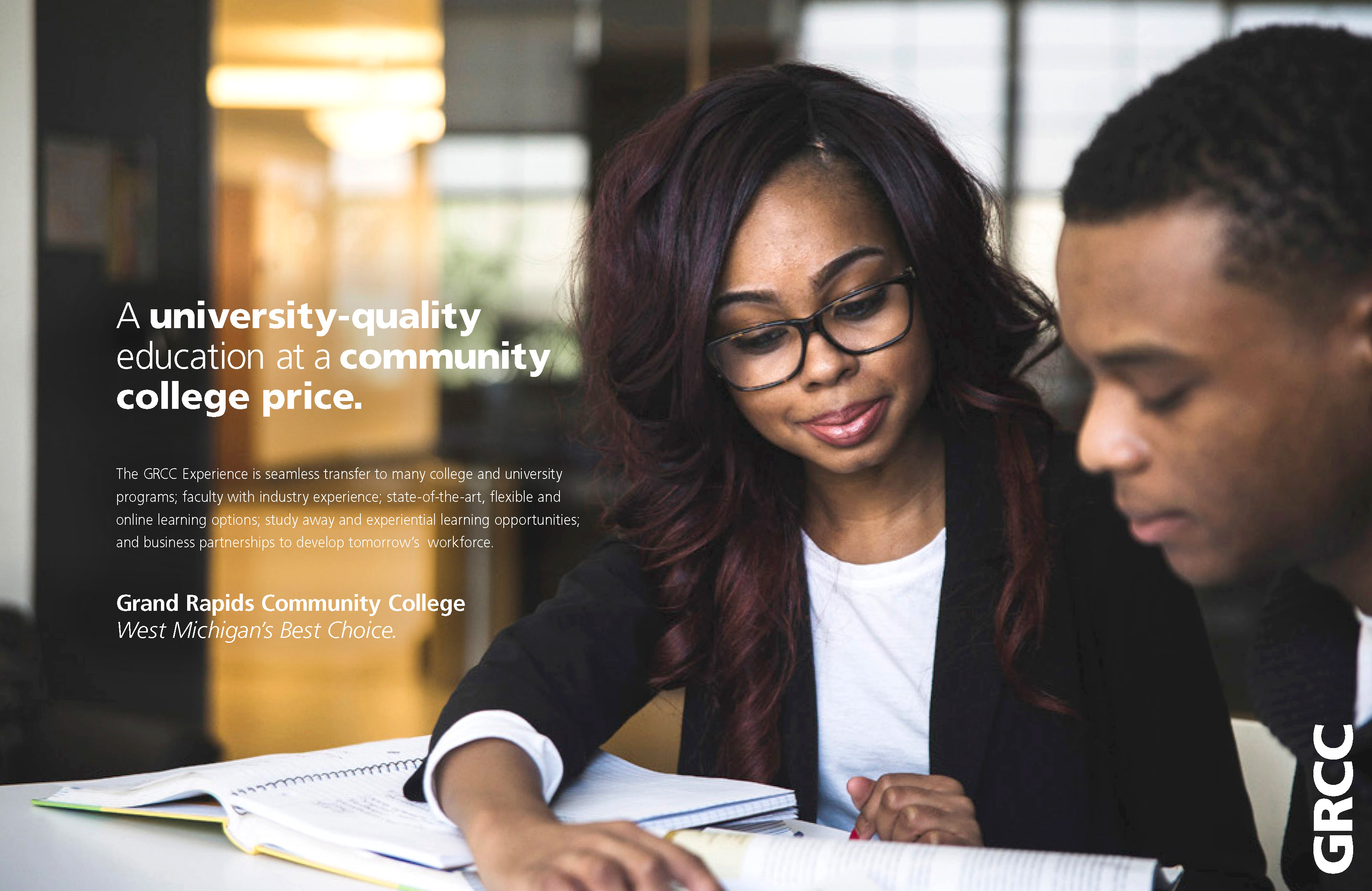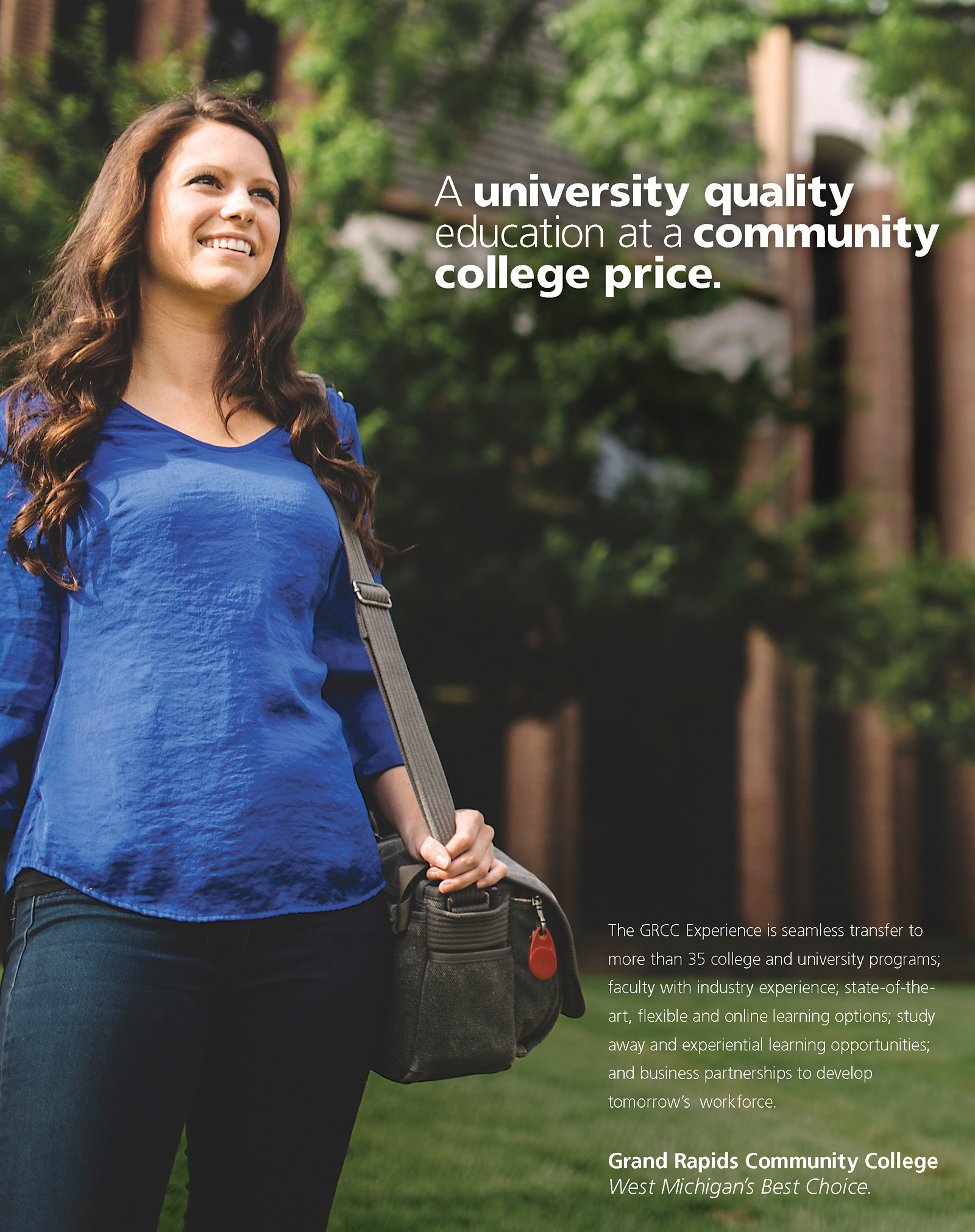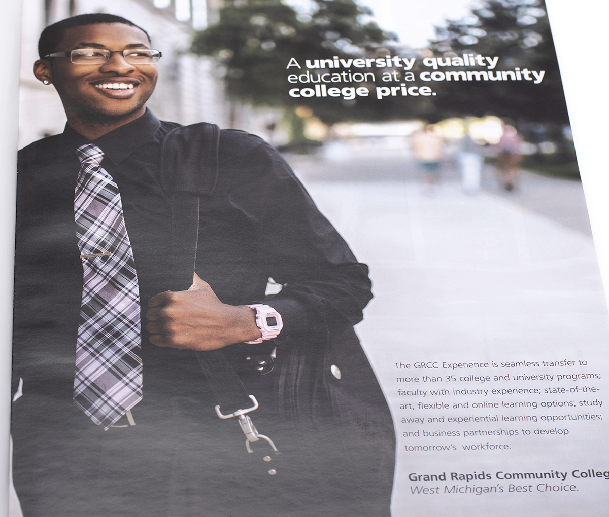 The Communications department wanted to use full-page photographs in college advertising that displayed more of the college campus alongside the student models. Full page images tend to be very cluttered and it is challenging to find a good placement for the copy.