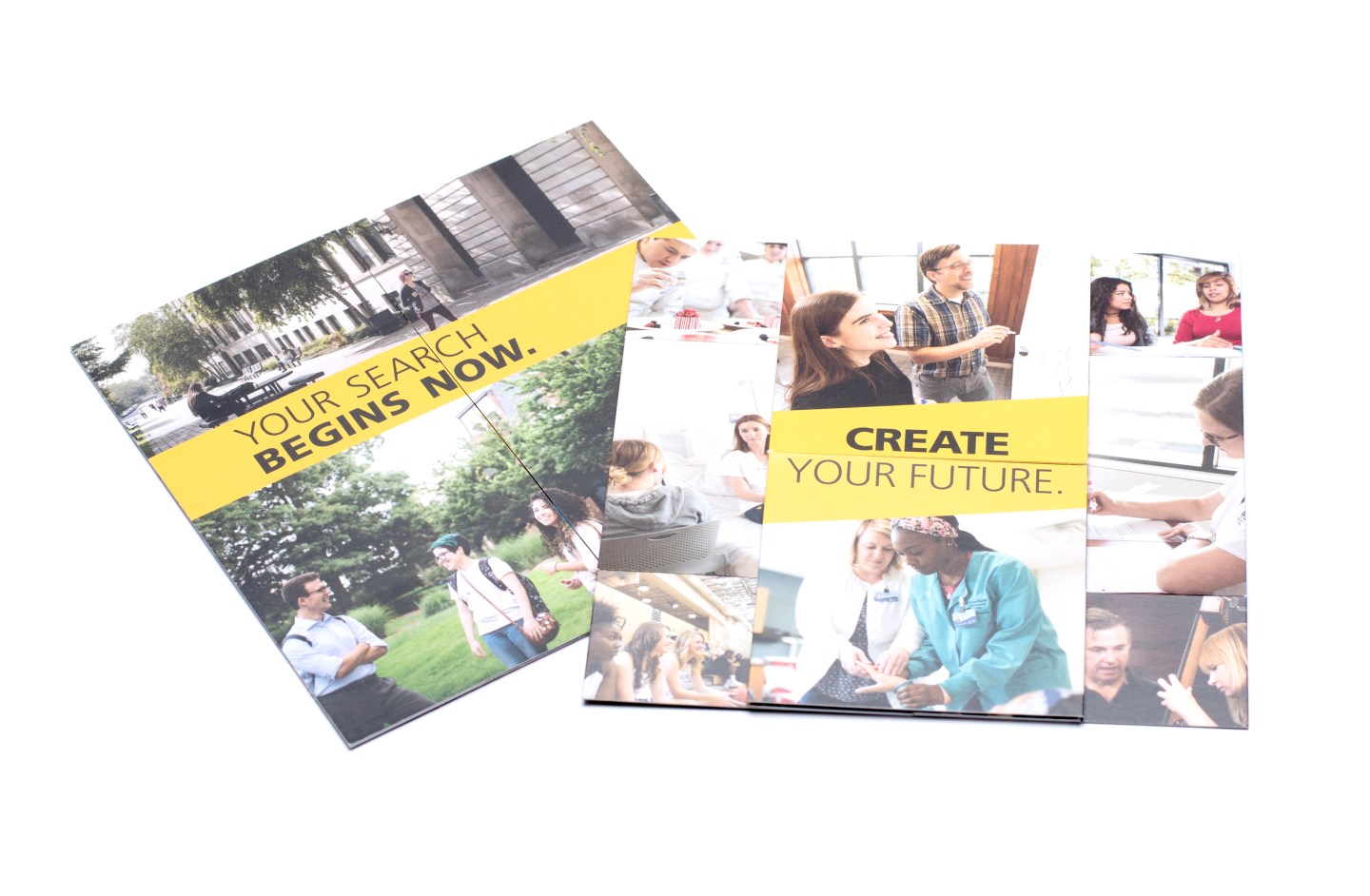 To create a takeaway piece for high school students, that presents a feel for life on GRCC campus. We wanted to tell the story of students attending college and follow different pursuits of interest. The piece has four folds each fold represents a different stage in the student’s learning process. The call to action “Connect. Explore.” is urging the student to contact us to schedule a tour.